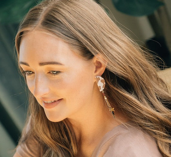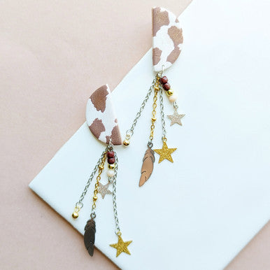 The Gracie earring may be the ultimate summer earring! It is ready to elevate your look for summer concerts, rodeos, vacations, girls nights, you name it! With a fun cowhide print mixed with feather and start charms. The different chains create a modern twist on your classic fringe. These earrings are stunning!