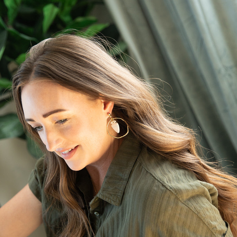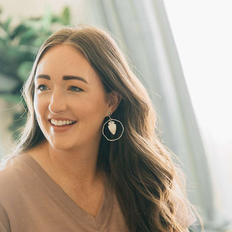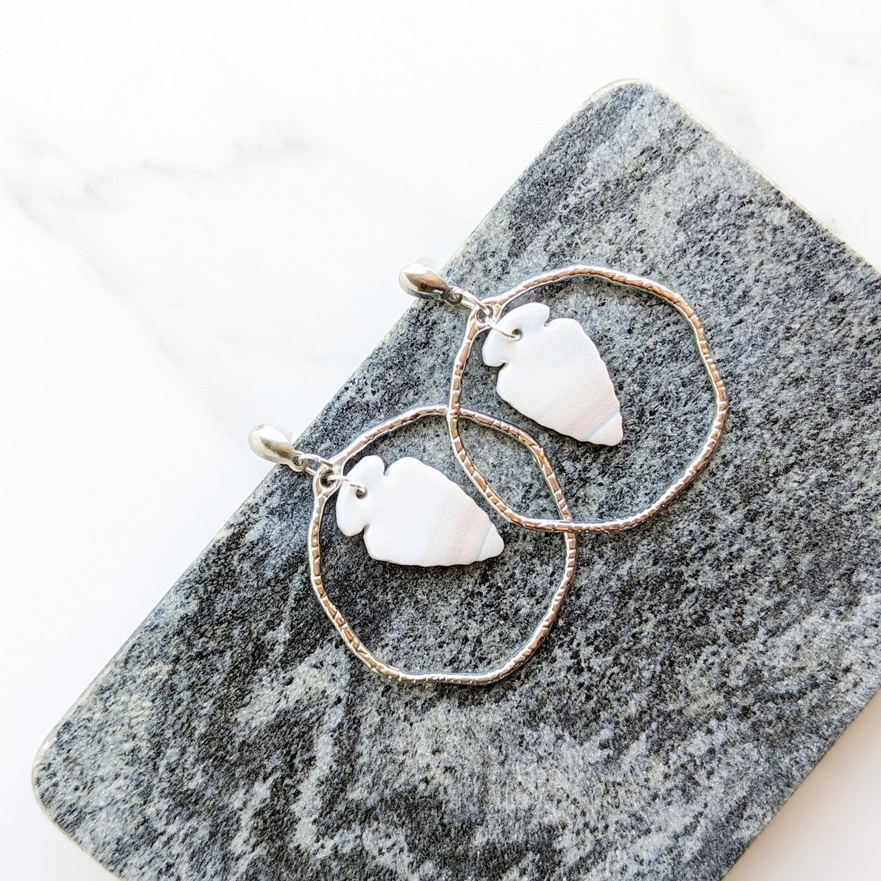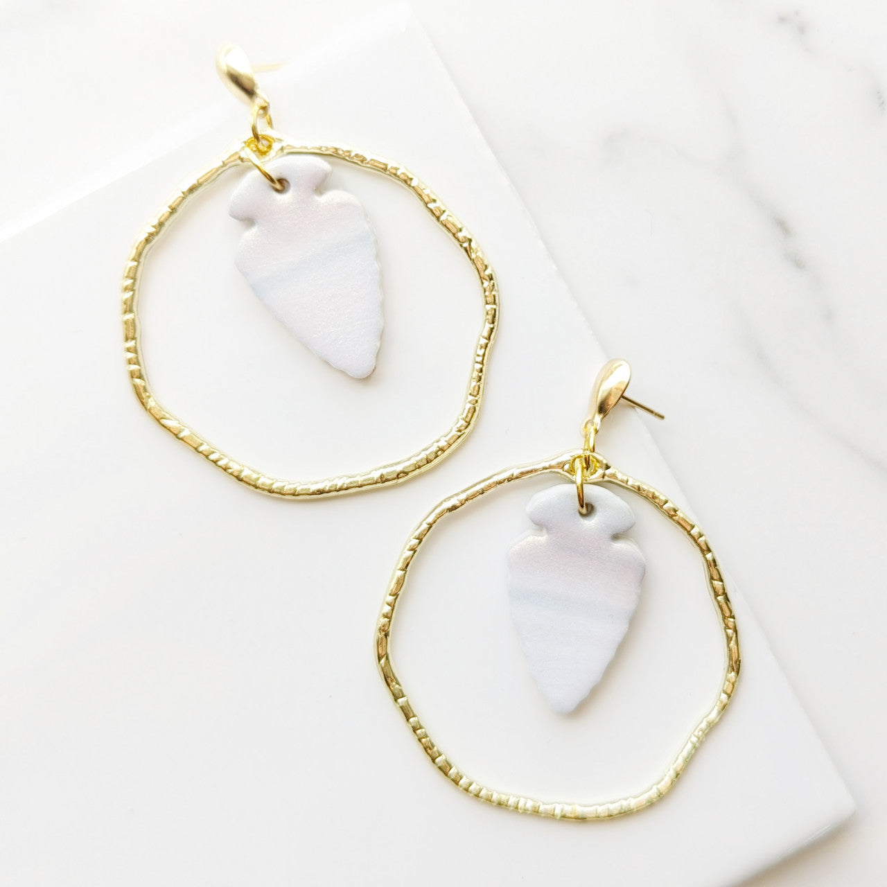 We took the original Opal Arrowhead design, on a smaller scale and paired it with a hoop for an added flare. The clay is white, shimmer clay with some added color in the background to create depth in the design. The shimmer on the clay is stunning when the light hits it.