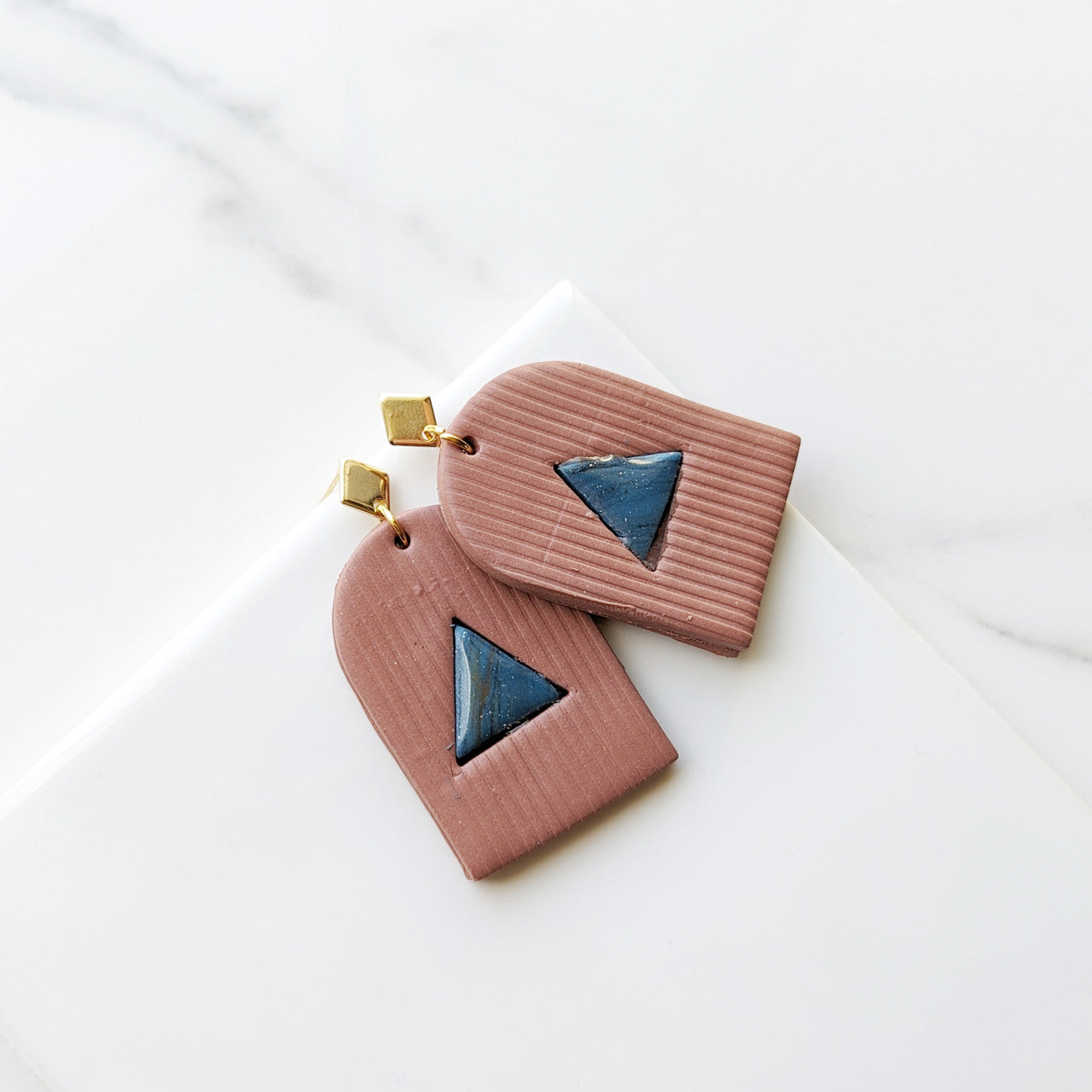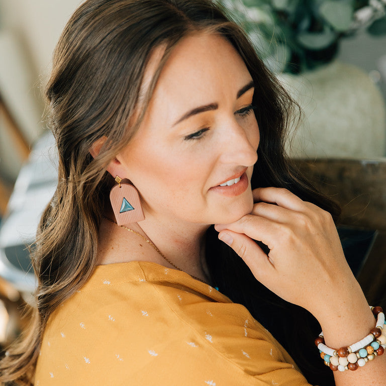 This classic shape is anything but boring with the details that have been added into the design. The texture of the lines combined with the marbled blue turquoise clay triangle is stunning. The Carolyn earring is a statement earring that is lightweight and eye catching. Polished off with the detail of a diamond shaped metal stud.
