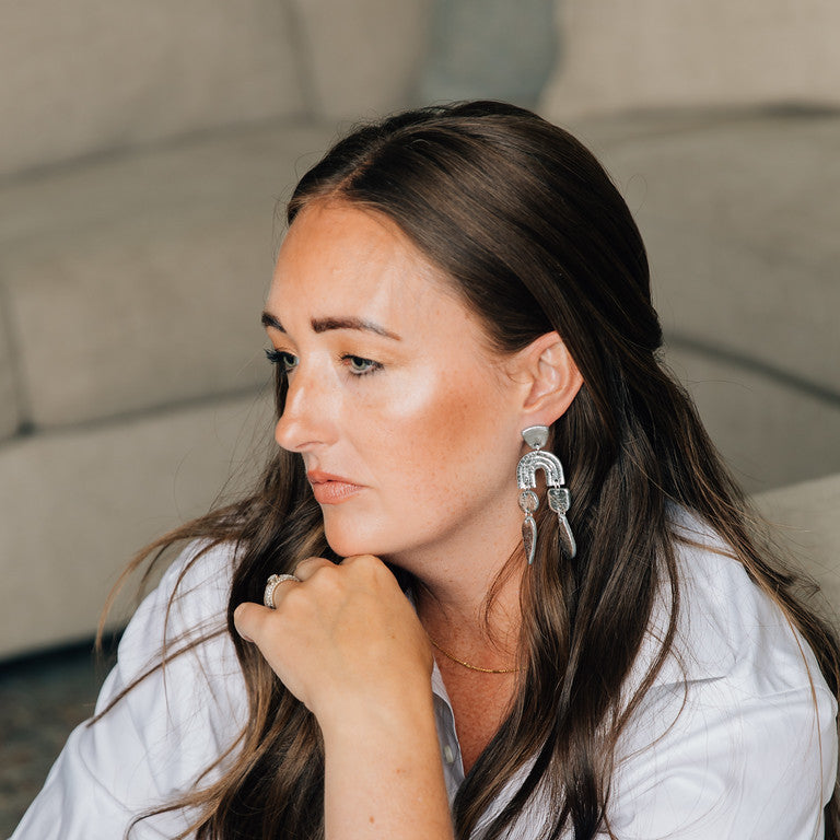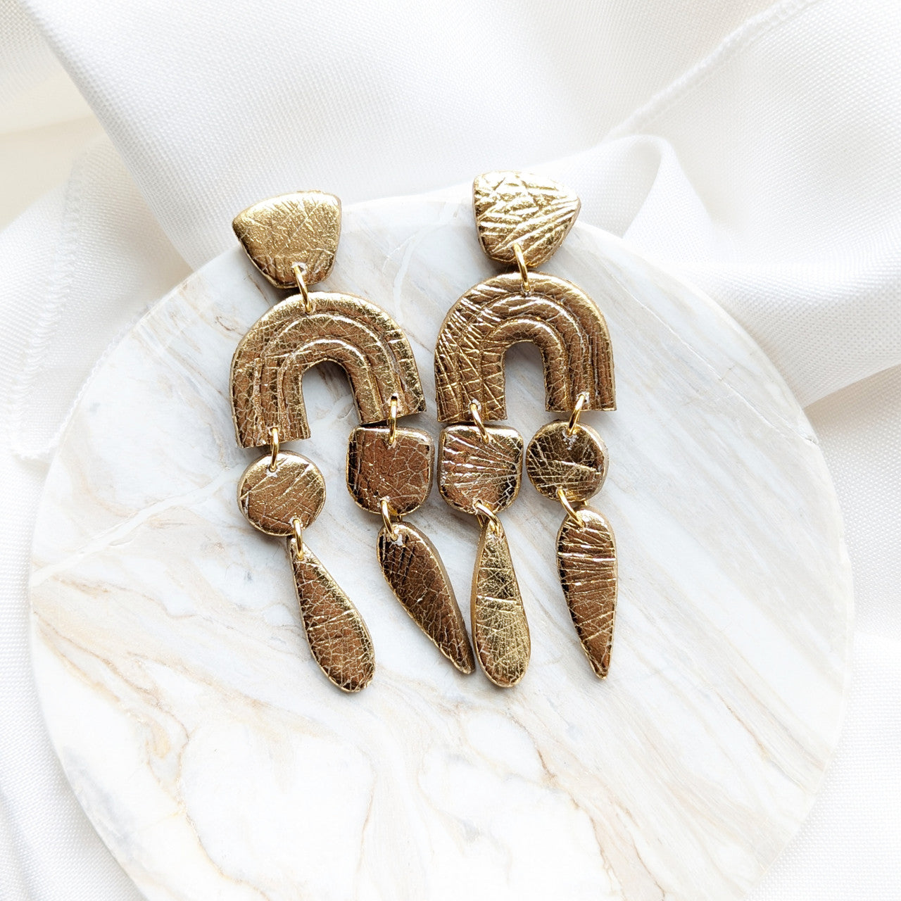 A bold, sculptural statement pieces handcrafted from lightweight clay for all-day comfort. Featuring a modern arch design with artfully dangling shapes, these earrings come in your choice of metallic silver or gold for a touch of luxe shimmer. Their bold size and playful movement make them the perfect accessory for turning everyday moments into occasions.