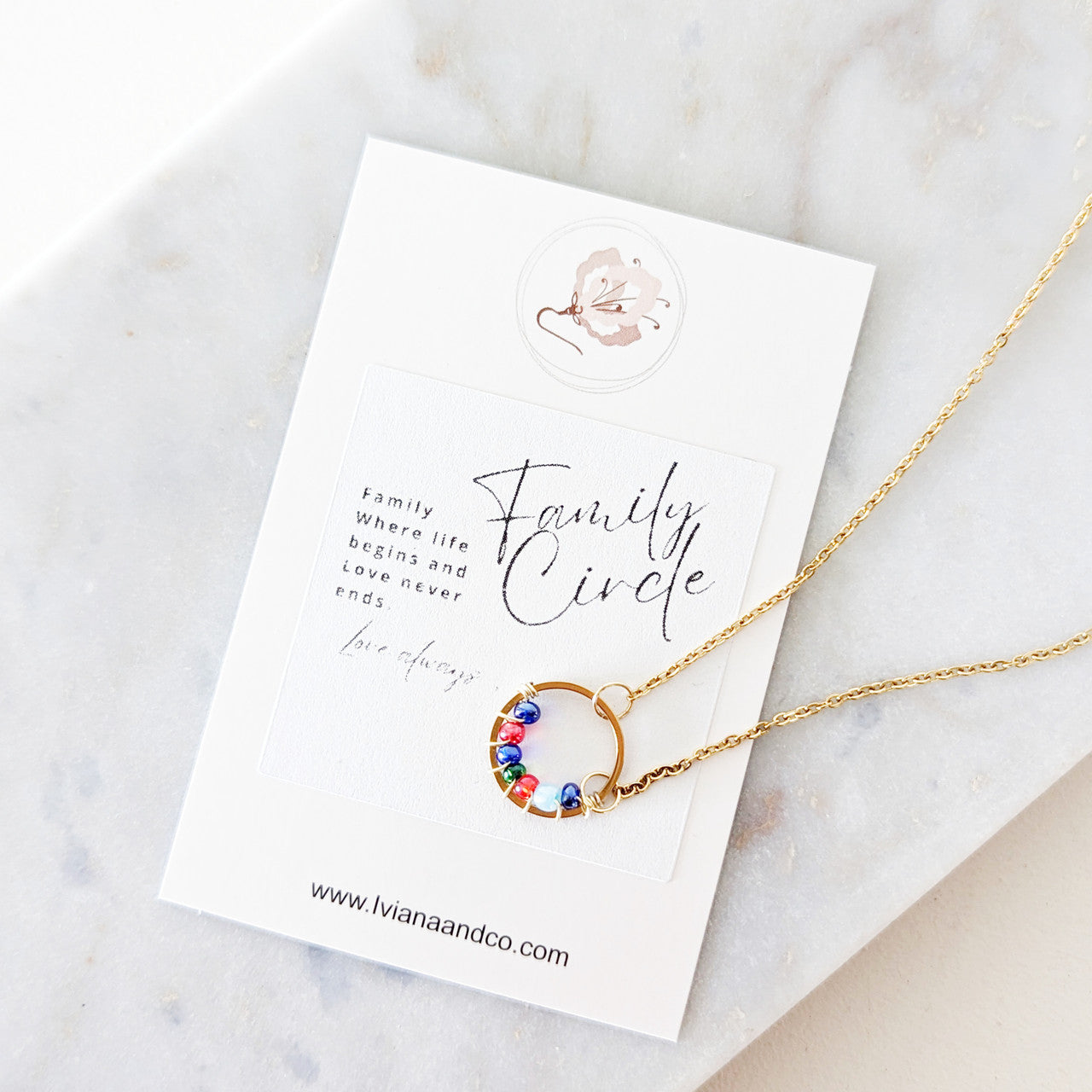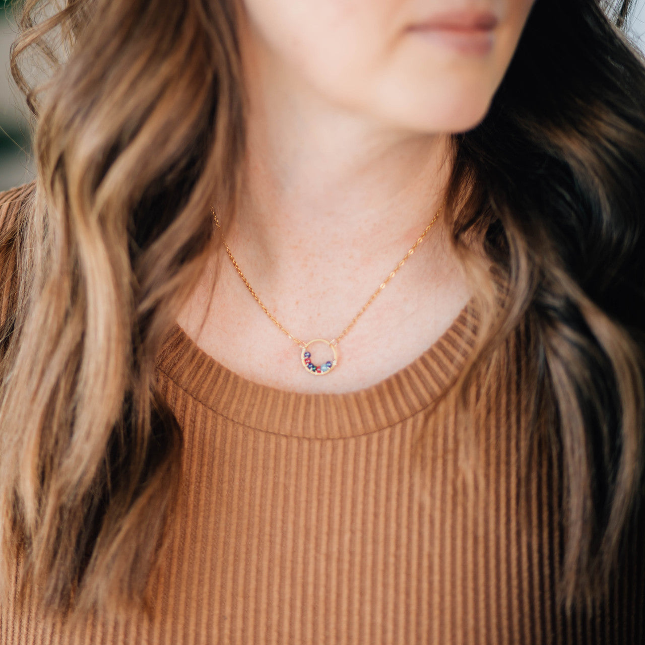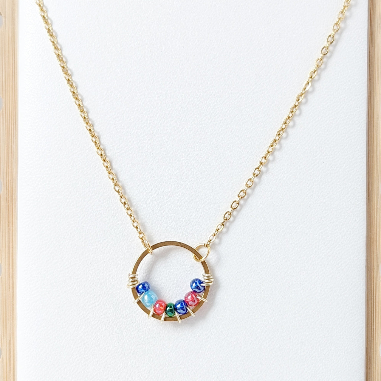 Celebrate the bonds that matter most with our Family Circle Necklace. This handcrafted pendant, available in both gold and silver stainless steel, features a small circle adorned with wire wrapped seed beads that represent birthstone colors—a beautiful symbol of family, unity, and individuality.