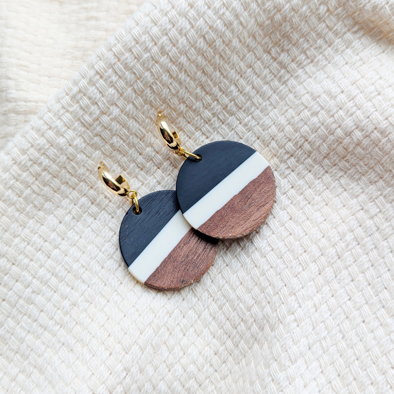 Wanting a unique take on a simple gold hoop? This neutral stripe wood pendant is a great addition.