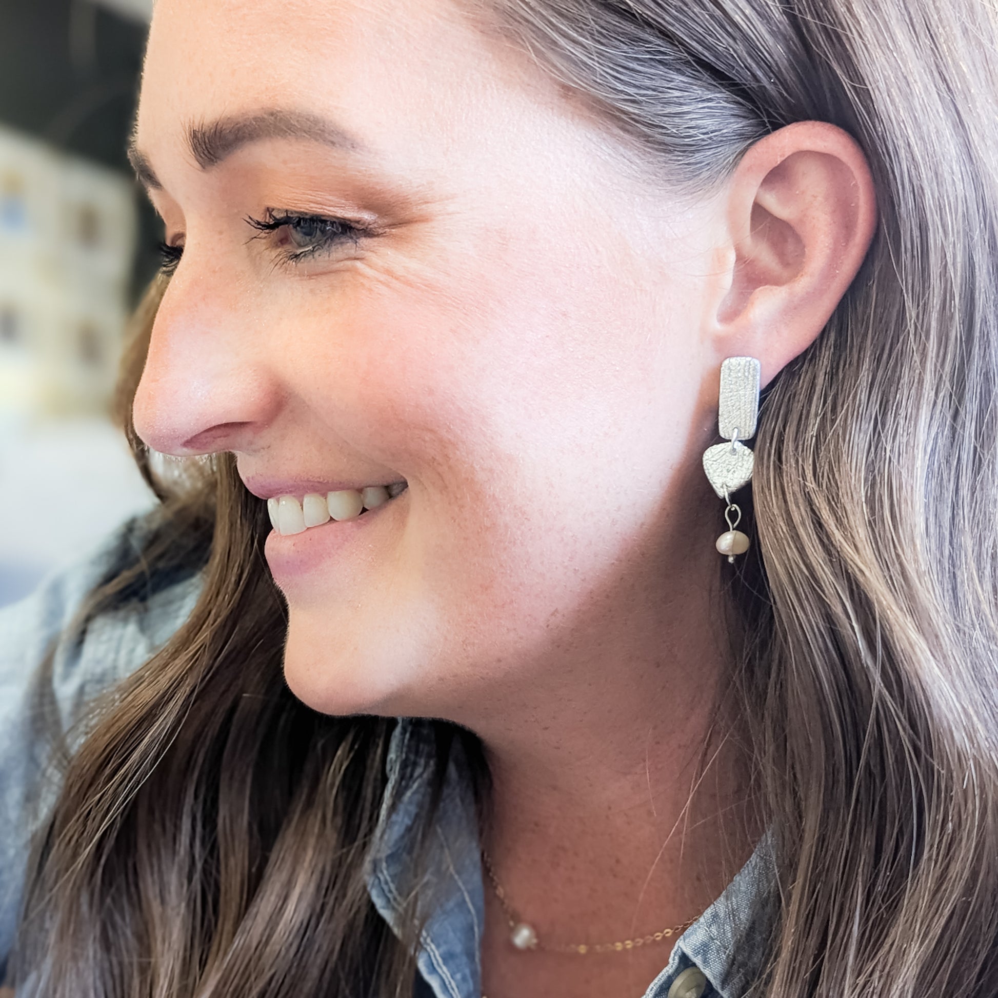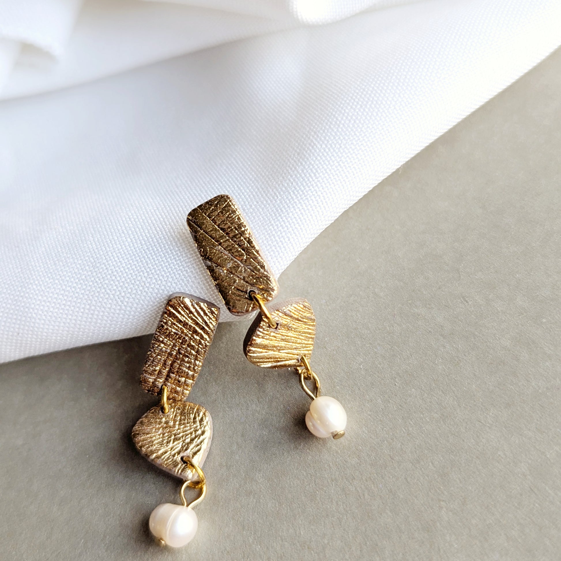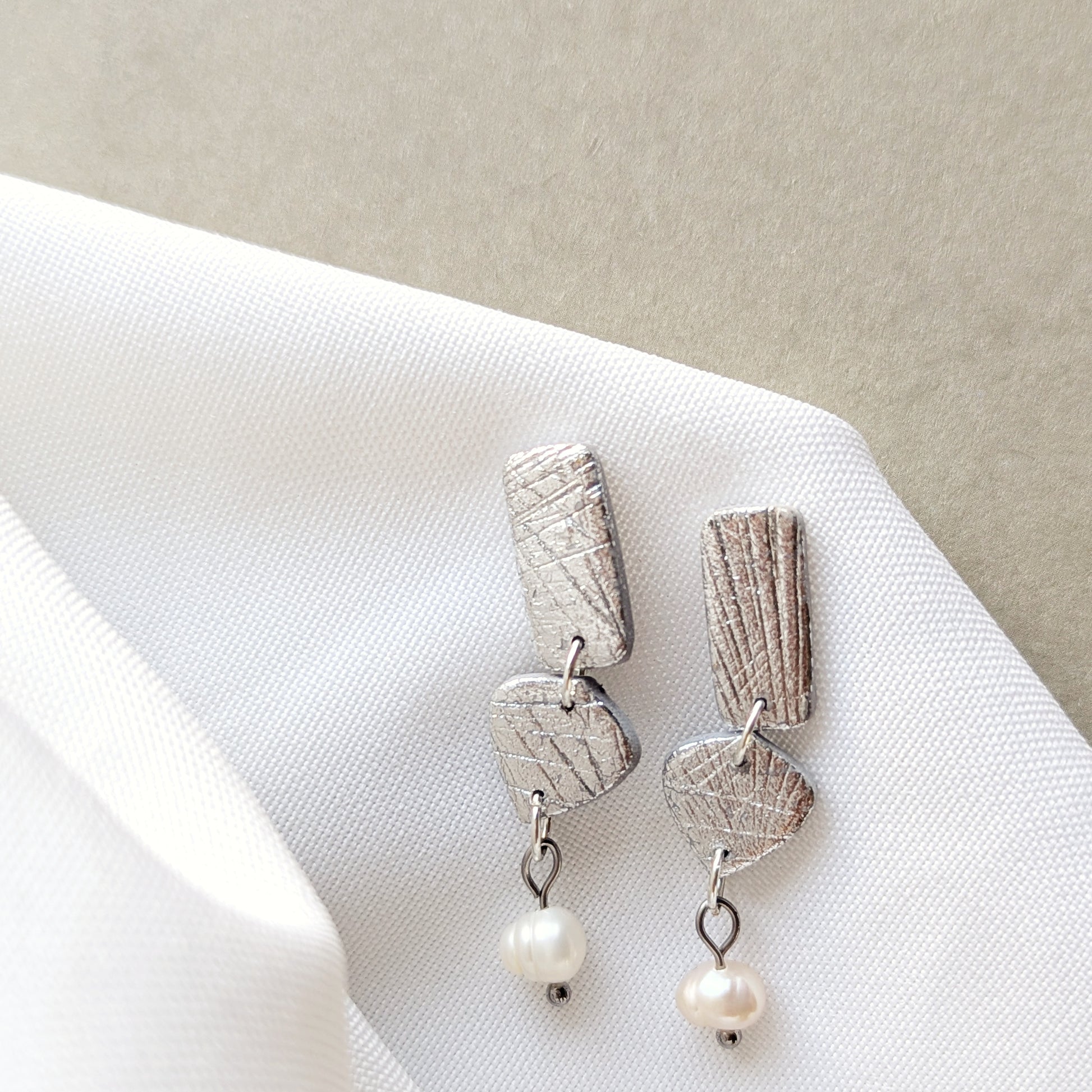 This silver or gold-embossed clay earring with a pearl drop is a nod to timeless style with a modern twist.
