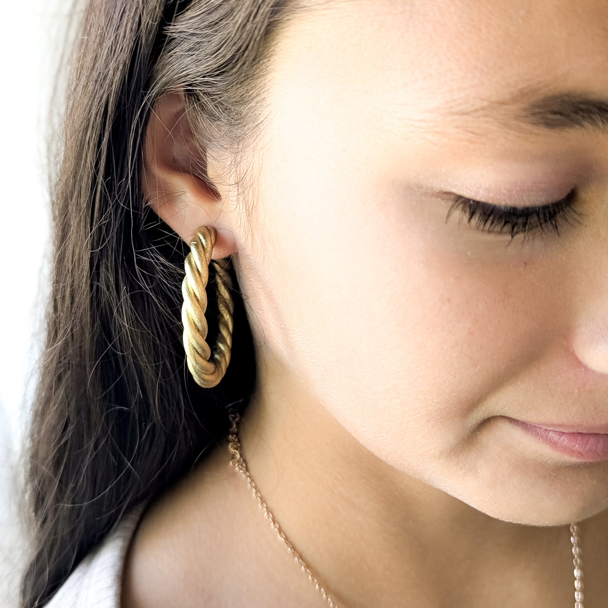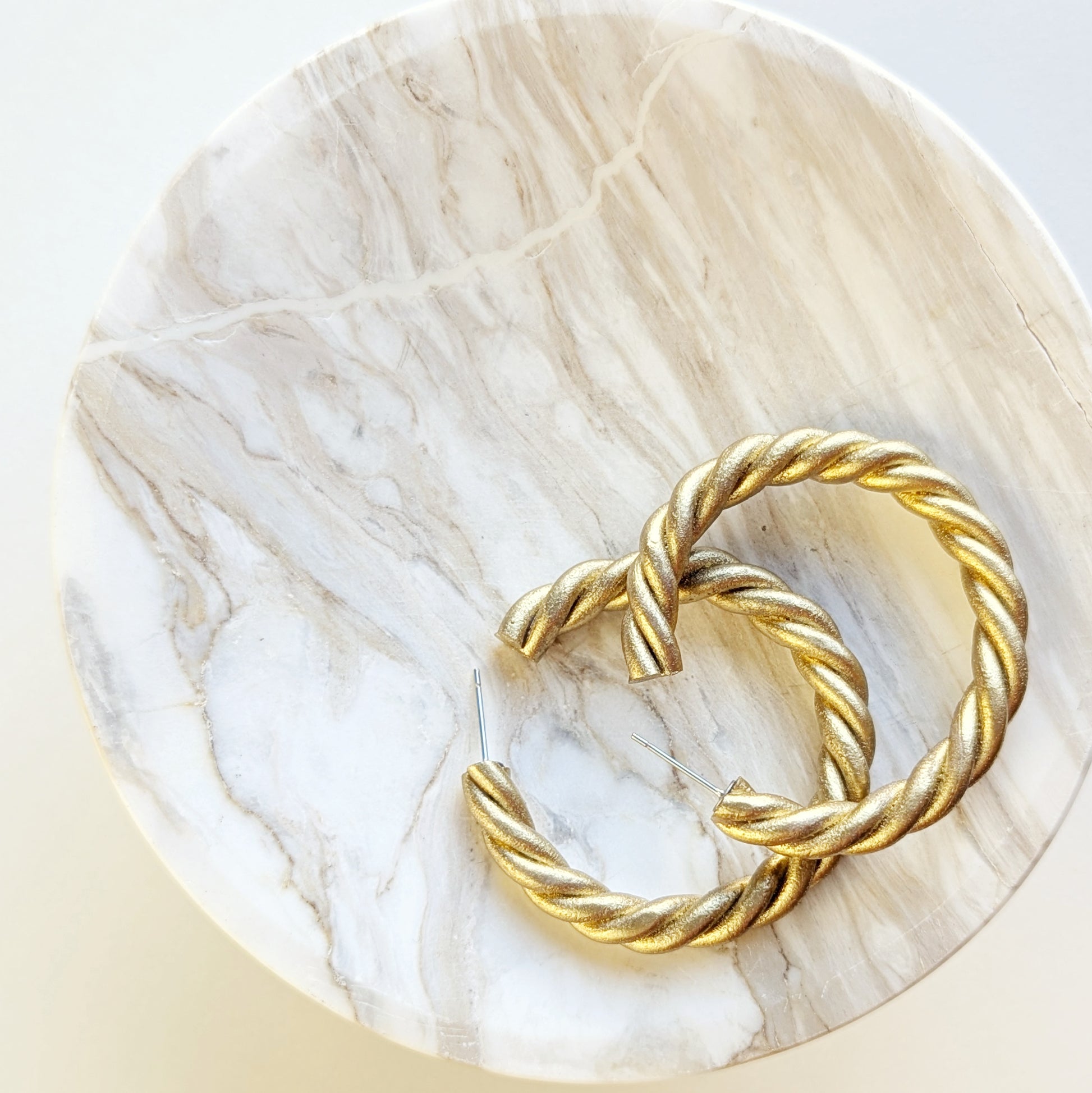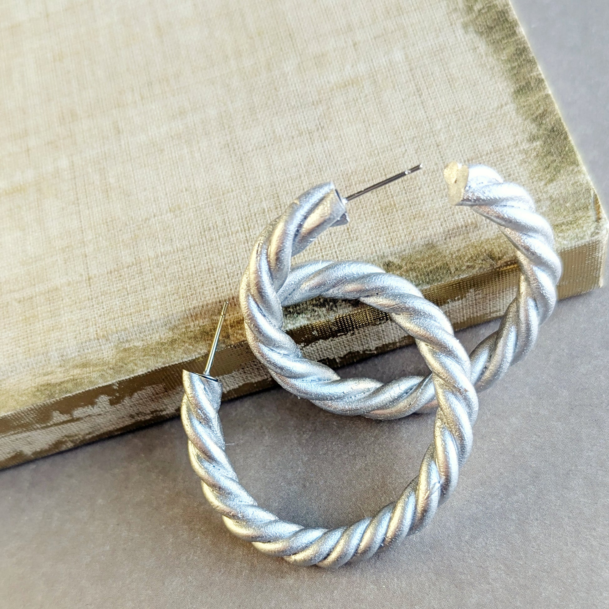 Handcrafted from clay, these hoops are shaped into a delicate twisted rope design available in silver or gold.