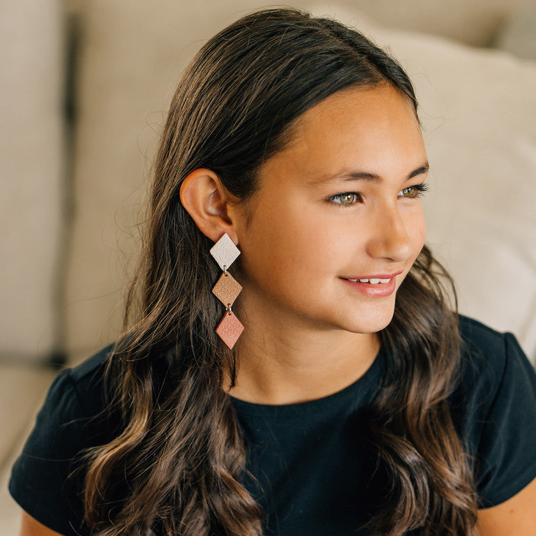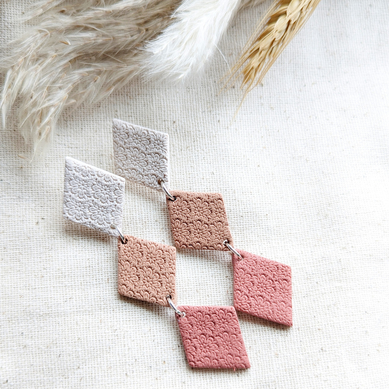 These diamond drop clay earrings are embossed with a beautiful floral pattern. Each piece its own unique color, but grouped together they make such a statement!