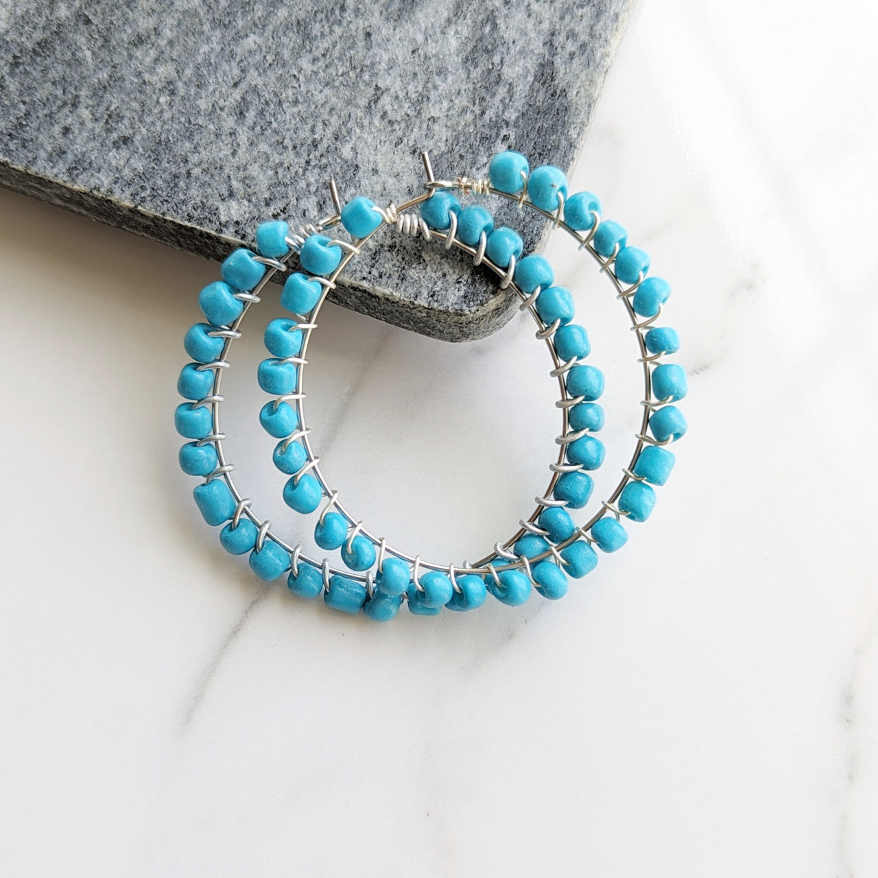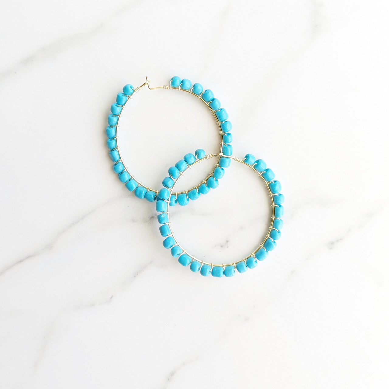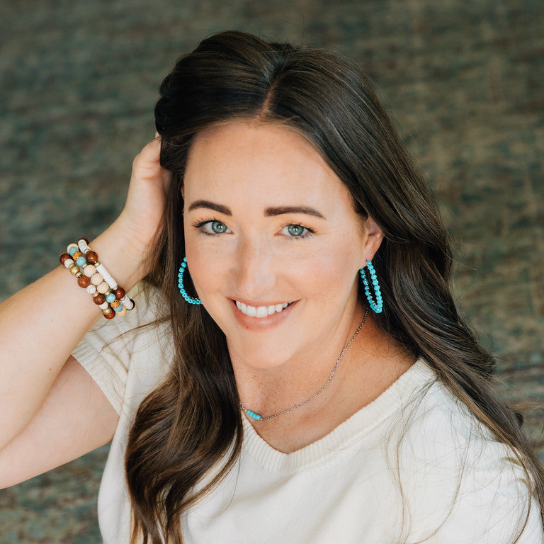 Two classic elements of summer are hoops and the color turquoise. Combine the two and you've got the perfect combo. Pull your hair up and add these hoops!